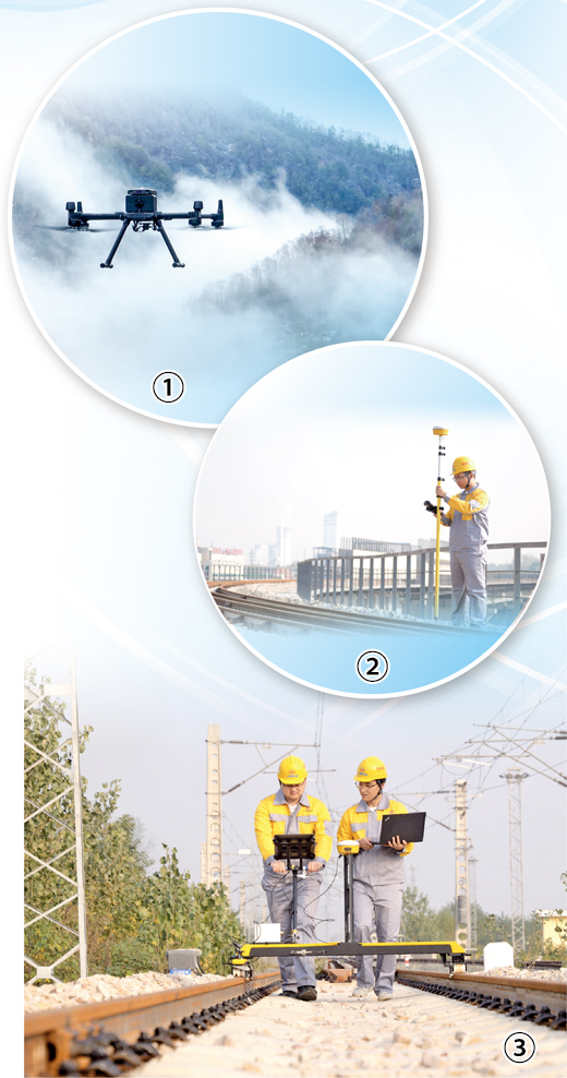 图②:工作人员运用北斗定位技术进行既有线测量。