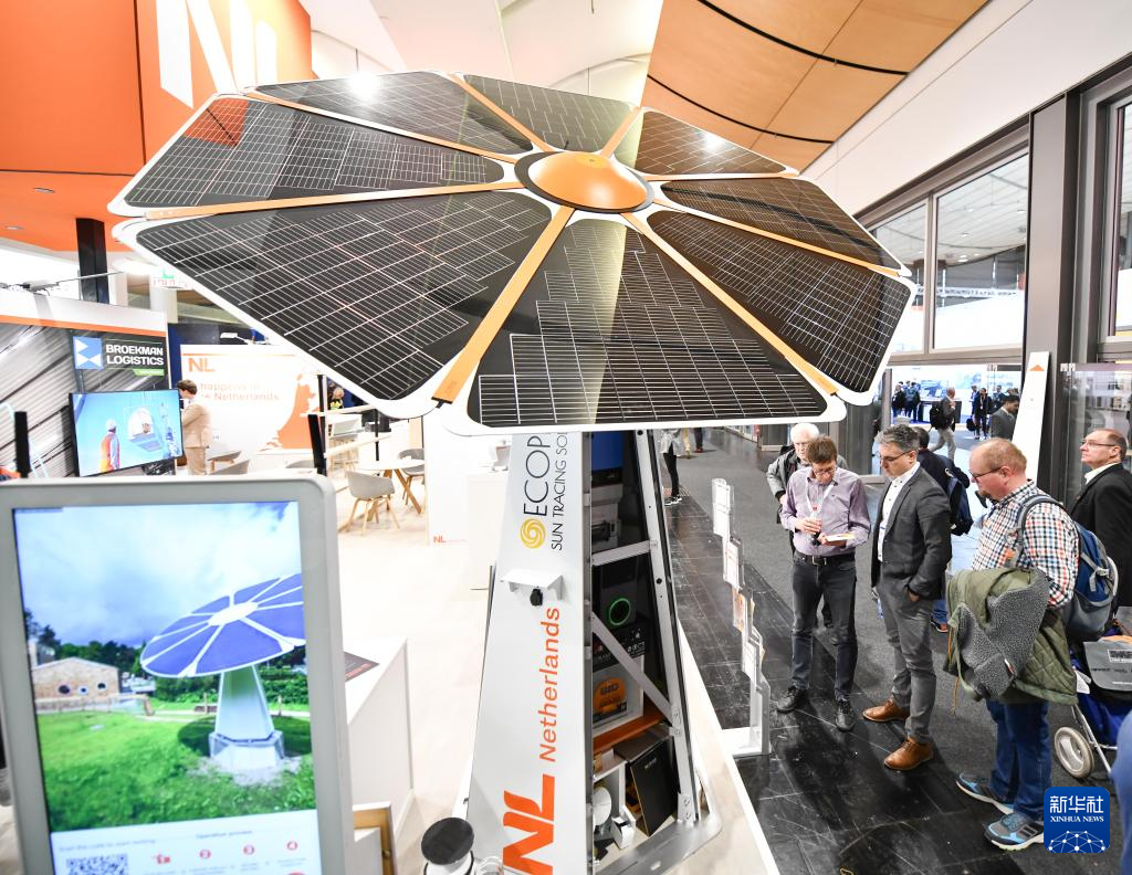 4月23日,人们在德国汉诺威工博会上参观一款光伏设备。该设备可根据太阳位置调整面板角度。