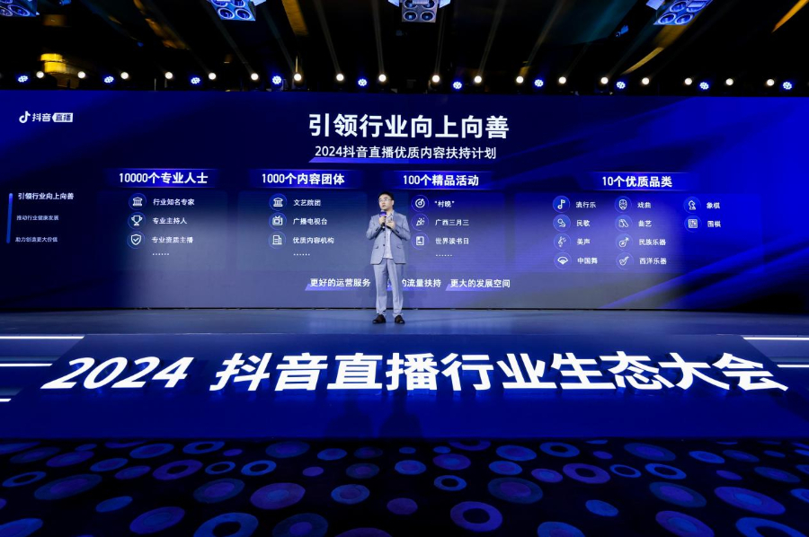 4月25日,2024抖音直播行业生态大会在京举行。会上,抖音直播发布优质内容扶持计划,宣布将提供亿级流量与现金,携手万名专业人士,带动千个内容团体,打造百项精品活动,扶持十个优质品类。与此同时,由文化和旅游部市场管理司指导,中国演出行业协会与抖音直播共同发起的“艺播计划-抖音直播院团专项”也进一步升级,将加大对文艺院团的扶持力度。