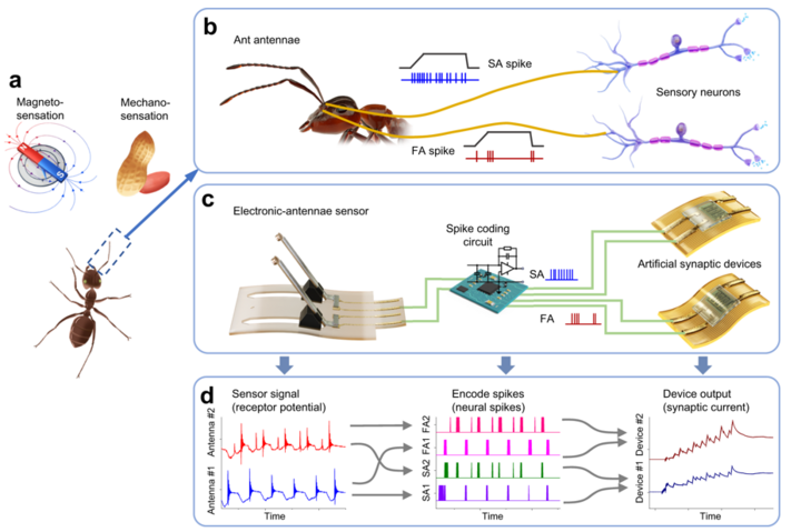 触角是昆虫的主要感觉器官,能够精准感知微小振动、磁场方位、重力方向或化学刺激,其感知灵敏度可与人类皮肤相媲美,甚至在一些特殊功能上超过人类。受此启发,南开大学教授徐文涛团队与日本北海道大学研究团队合作,成功研制出一种神经形态人工触角系统,实现了类似蚂蚁触角传入神经的触觉感知和磁场感知功能。