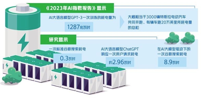 人工智能大模型到底有多耗能?据斯坦福人工智能研究所发布的《2023年AI指数报告》,AI大语言模型GPT-3一次训练的耗电量为1287兆瓦时,大概相当于3000辆特斯拉电动汽车共同开跑、每辆车跑20万英里所耗电量的总和。报告同时提出,AI大语言模型GPT-3一次训练,相当于排放了552吨二氧化碳。