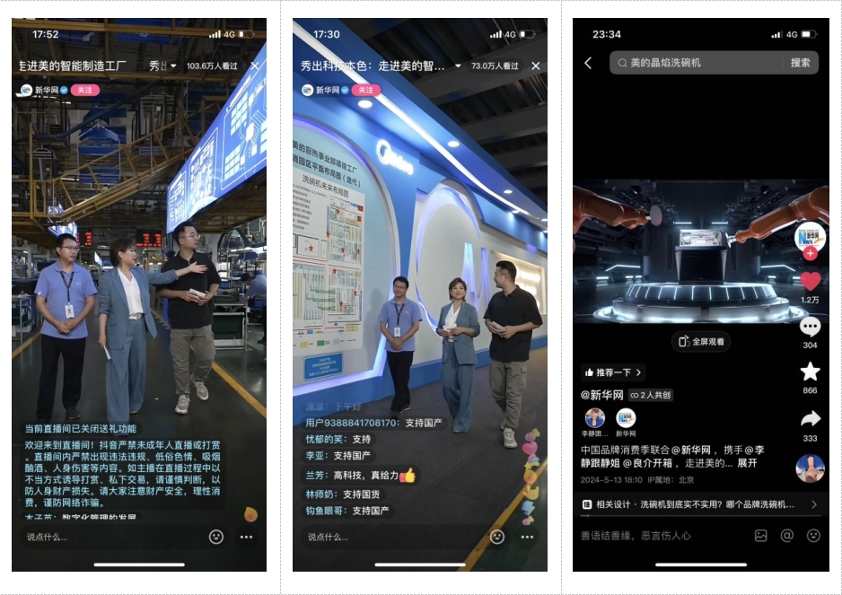 本次「510中国品牌消费季-秀出科技本色」活动,抖音电商为平台用户筹备了丰富的参与玩法,并调动全域资源为国货品牌商家提供多元化资源支持,帮助他们抓住中国品牌日热点下的增长契机。期间,活动联合人民日报账号落地耐消国货直播,围绕国货好价,带货品牌包括华为、苏泊尔、TP-LINK等;5月14日,活动联合@新华网,携手主持人@李静、科技开箱达人@良介开箱,走进美的洗碗机工厂,探秘美的洗碗机背后的“黑科技”。