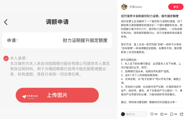 据悉,这种用户自己提交材料申请提额的方式在银行业已普遍应用,并非花呗首创。如招商银行用户可以通过掌上生活提交财力证明,申请提升信用卡固定额度。可用作证明的材料包括交易流水、纳税信息、社保证明等。