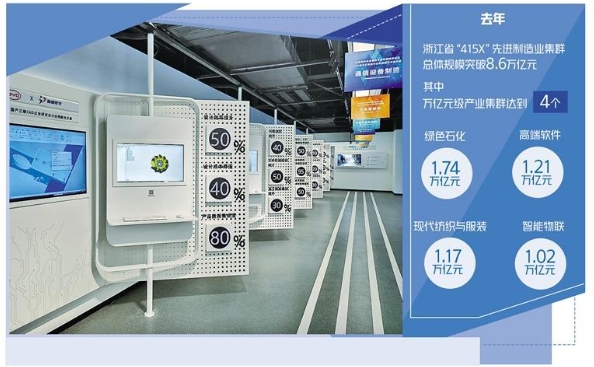 浙江省经信厅近期公布的数据显示,去年,浙江省“415X”先进制造业集群总体规模突破8.6万亿元,其中,万亿元级产业集群达到4个,分别是1.74万亿元的绿色石化、1.21万亿元的高端软件、1.17万亿元的现代纺织与服装以及1.02万亿元的智能物联,新能源汽车及零部件集群也接近1万亿元。浙江提出建设全球先进制造业基地的目标,推动传统产业高端化、智能化、绿色化转型,优化提升产业链、供应链水平,引领浙江制造业迈向价值链中高端,擦亮“浙江制造”品牌。