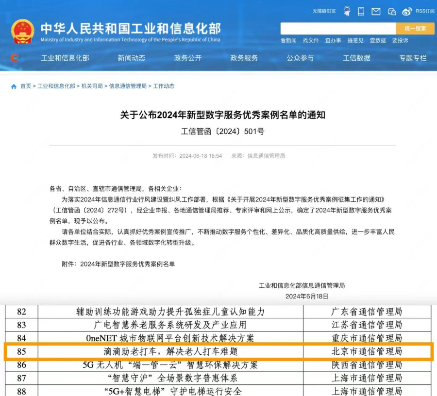 滴滴助老打车入选工信部“2024年新型数字服务优秀案例”
