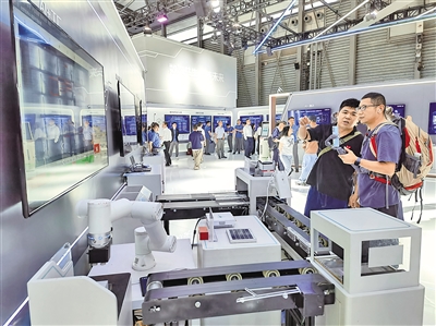在中国移动展台,观众观看“AI+工厂”展项。记者 陈爱平 摄