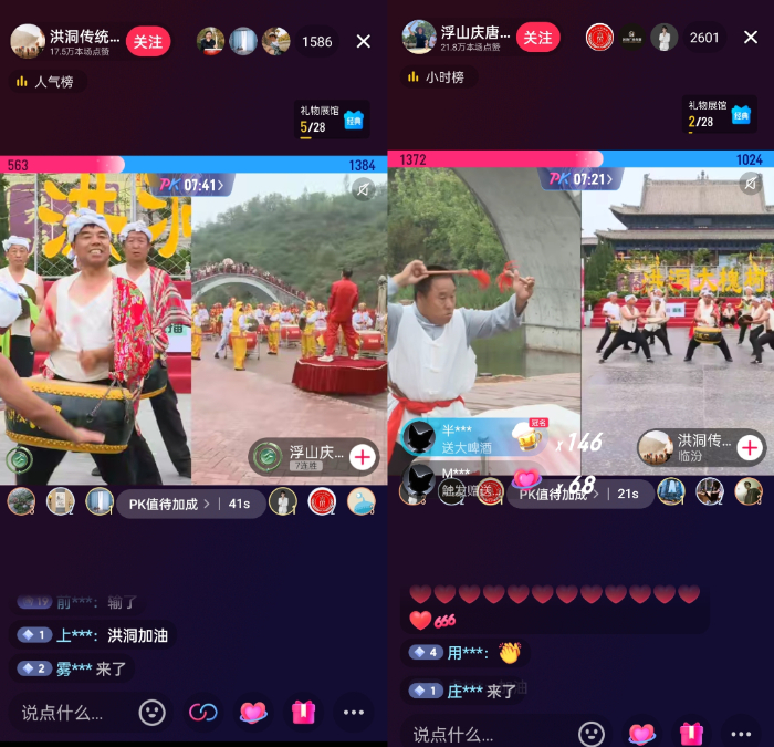 首场直播PK赛中上阵对垒的,是洪洞传统锣鼓队与浮山庆唐观锣鼓队。两队分别在直播PK环节带来《乱撕麻》《庆唐观神鼓》等传统曲牌表演,引来290万人次线上观看。全国各地观众在抖音直播间里以打赏、点赞表达支持。