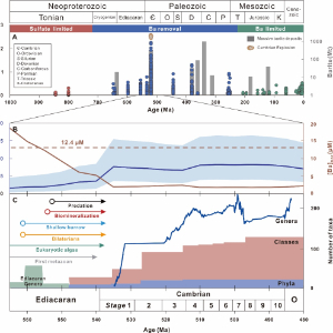 近期,卫炜等人通过扬子板块下寒武统富金属页岩的钡同位素数据发现,埃迪卡拉纪-寒武纪过渡时期海洋的逐渐氧化提升了硫酸根浓度,导致此前累积的溶解钡离子以重晶石形式被大量移除。水体中高浓度的钡会抑制水生动物的存活率,因此,对动物有毒害作用的硫化物和钡离子的移除,改善了海洋的宜居性,促使了寒武纪生命大爆发。