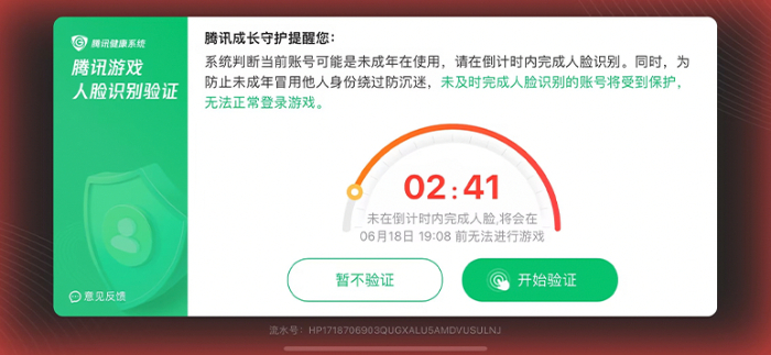 其次,全新上线人脸识别“炸弹锁”,进一步提高代过门槛。当用户触发人脸识别“炸弹锁”后,必须在倒计时内,在同一设备上完成人脸识别,否则该账号将被系统判定为疑似未成年人纳入管控并处罚封禁一段时间,有效避免租号黑产帮代过的情况。