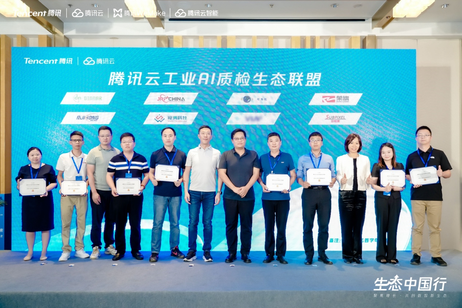 会上,荣旗工业科技(苏州)股份有限公司、苏州鼎纳自动化技术有限公司、昆山瑞弘测控自动化设备有限公司、视溯科技(上海)有限公司、昆山捷嵘发测控设备有限公司、昆山可为视智能科技有限公司、苏州亚相素自动化科技有限公司等首批伙伴与腾讯云宣布成立工业AI质检生态联盟。