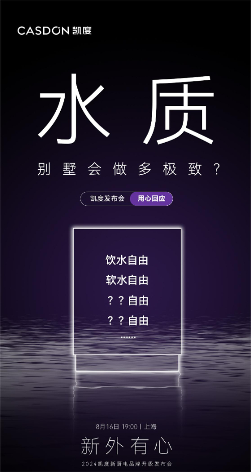 值得期待的还有全球原创的全屋净水“新物种”,作为凯度新厨电真正意义上的战略新品,这款净水产品也将在本次发布会进行亮相,引发净水领域对健康好水、安全饮水的话题热议。据悉,这款产品将以其独有的产品设计让广大用户享受到饮水自由、软水自由及更多用水自由。值得期待的是,这样的一个全屋净水“新物种”的零售价格将带来惊喜。
