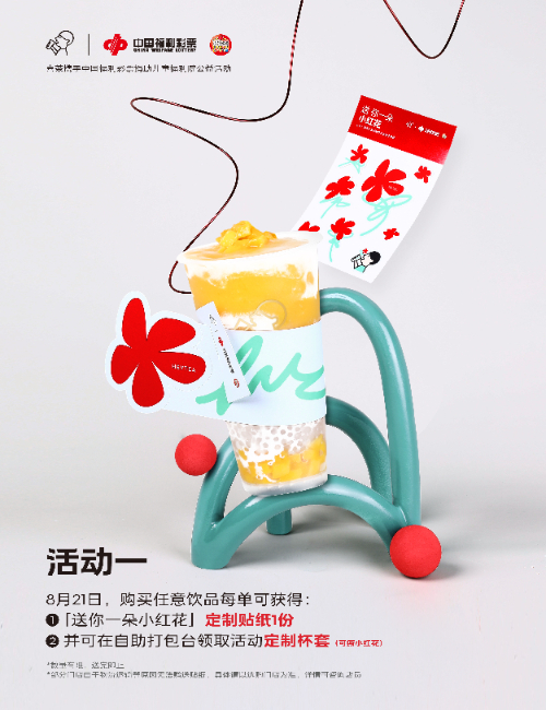 喜茶携手中国福利彩票以这些周边为基础,在线上和线下与用户进行多样化的互动。8月21日,在喜茶门店购买任意饮品即可获得定制的“小红花贴纸”。消费者可凭贴纸参与门店“爱心收集打卡”活动,把“小红花贴纸”贴在门店爱心形状的海报上,以此向儿童福利事业献出自己的爱心小红花。
