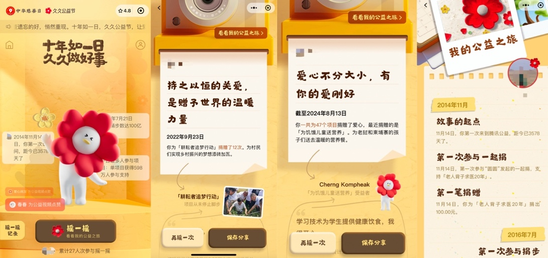 9月1日0点开始,用户打开腾讯公益小程序,即可参与这个活动。用手机摇一摇,用户就能在小程序中随机摇出在腾讯公益平台上曾经做过的好事,并将与之相对应的公益项目中受益人的故事,一并展现给用户;摇出的所有好事记录,最终会形成专属于每个人的十年公益之旅。