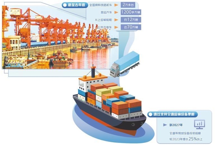 据统计,截至去年年底,全国拥有铁路机车2万多台、营运汽车1200多万辆、水上运输船舶约12万艘、公共汽电车近70万辆,这当中有部分设备老旧,能耗排放高,是需要更新的,更新体量规模较大。为了推动设备更新加快落地,交通运输等部门开展了周密部署。