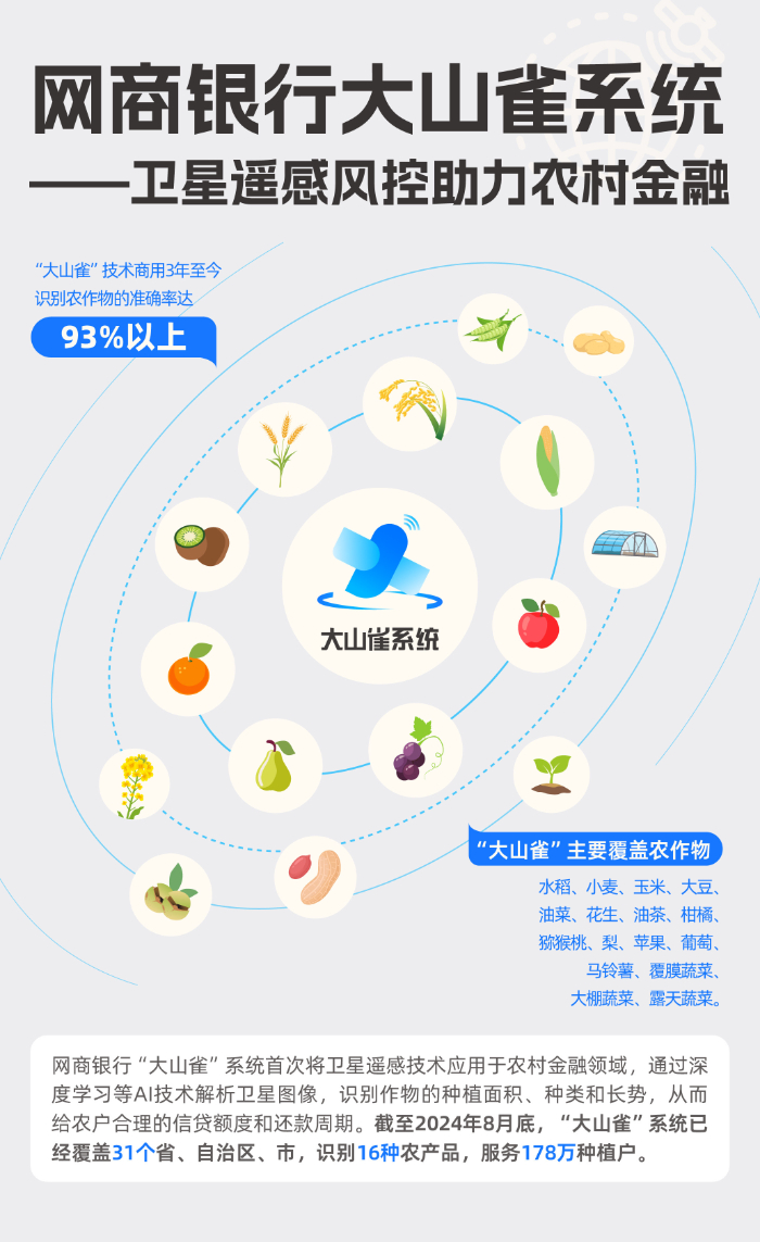 “大山雀”应用范围也在不断扩展。网商银行与农业农村部大数据发展中心联合建模,发起“农户秒贷”项目,运用“大山雀”卫星遥感风控系统与隐私计算技术,将三农数据引入金融风控,为农户提供手机上随借随还的信贷服务。2024年,该项目入选国家数据局“数据要素X”典型案例。