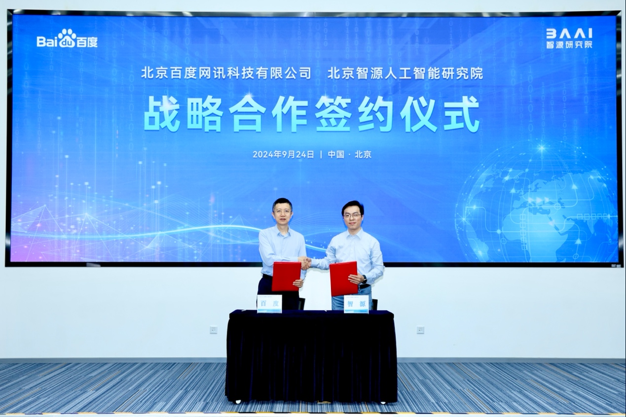 9月24日,北京百度网讯科技有限公司(简称“百度”)与北京智源人工智能研究院(简称“智源研究院”)正式签署战略合作协议,双方将充分发挥互补优势,在大模型等领域展开深度合作,共同构建人工智能产研协同生态。