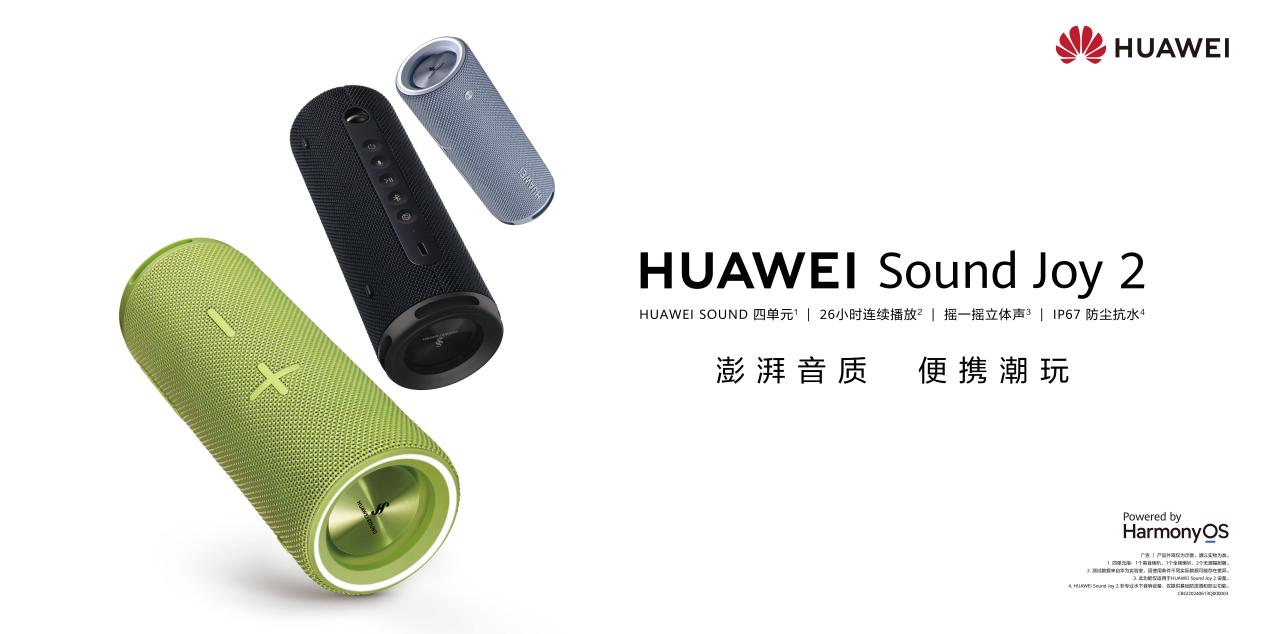 发布会同时公布了华为Sound 系列最新产品——HUAWEI Sound Joy 2。新品在音质、续航、智慧三大“硬实力”方面着重发力,力求给用户带来好听、好看、好玩的户外音乐体验。它小巧便携、防水抗尘,适合大多数户外运动场景。