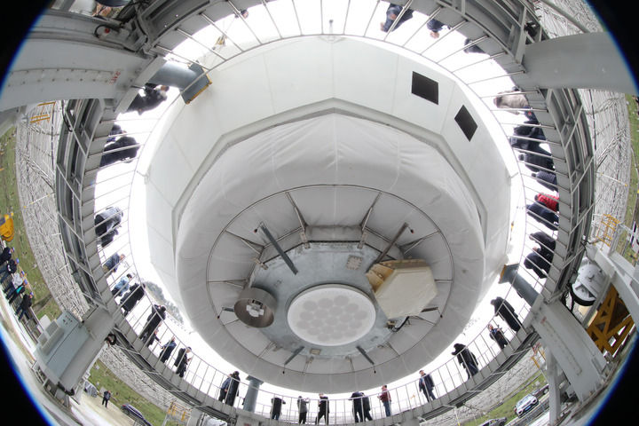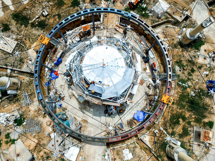 ↑2016年4月10日,工作人员在安装“中国天眼”馈源舱(无人机照片)。新华社记者欧东衢摄