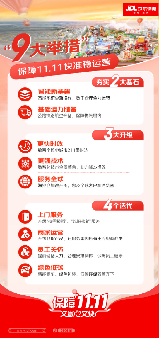 针对今年11.11,京东物流重磅推出九大举措,不仅进一步夯实智能新基建和多种运力两大“基石”,还在时效、技术、国际物流、上门服务、商家运营、员工关怀、绿色低碳等7个方面全方位升级迭代,充分发挥一体化供应链核心优势,助力多平台商家平稳运营、消费者体验“又省心又快”。