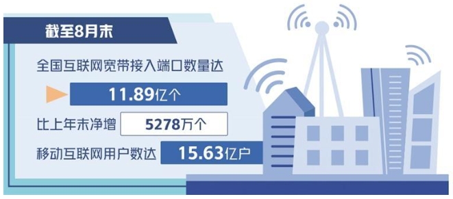 截至8月末,全国互联网宽带接入端口数量达11.89亿个,比上年末净增5278万个;移动互联网用户数达15.63亿户。三家基础电信企业及中国广电的移动电话用户总数达17.78亿户;三家基础电信企业发展蜂窝物联网终端用户25.65亿户,占移动网终端连接数的比重达59.1%。
