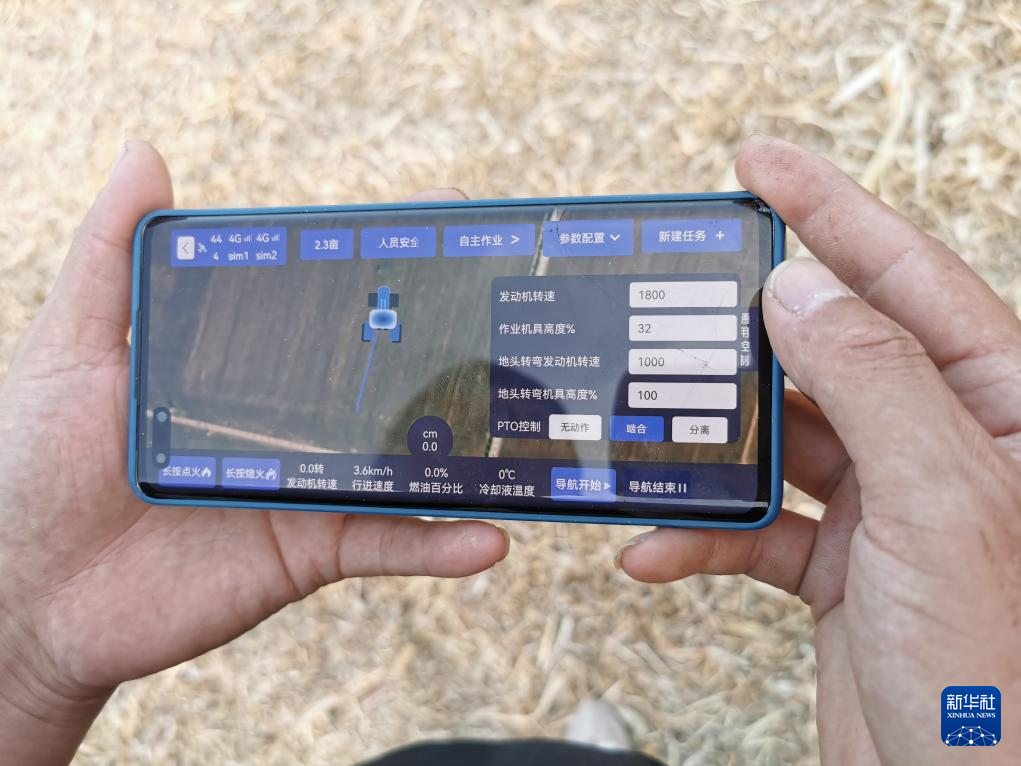 在作业现场,安阳晓松专业种植合作社负责人张先智向记者展示了遥控指挥无人驾驶拖拉机的手机界面,小小的一块屏幕里包含了行进速度、燃油百分比等多项数据信息。