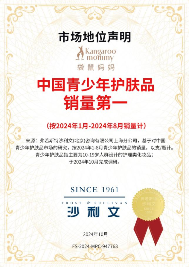 据国际市场调研机构沙利文认证,袋鼠妈妈2024年1-8月份的青少年护肤品市场销量第一。严二平表示,在销量背后是对产品和服务的认可,更是对品牌的信任和口碑。