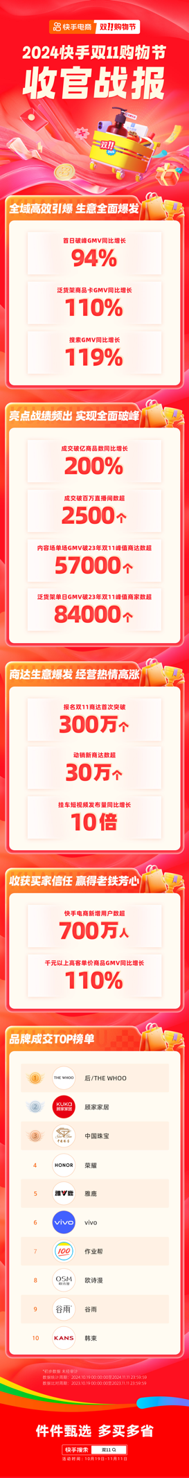 11月12日,快手电商发布双11购物节收官战报。依托内容场与泛货架场域的全域爆发,快手电商双11购物节GMV同比强劲增长,再创新高,刷新了快手电商大促的多项纪录。