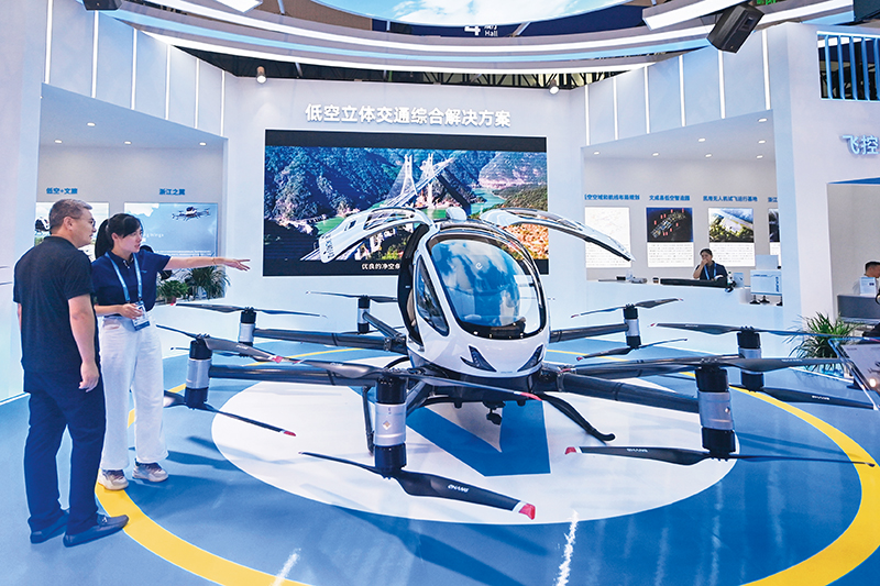 观众在杭州举办的第三届全球数字贸易博览会上了解一款无人驾驶载人航空器(2024年9月25日摄 ) 黄宗治摄/本刊