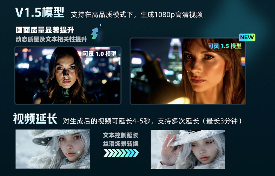 此次API升级加入了可灵最新的v1.5高品质模型,支持1080P高清视频输出,和可灵 1.0 模型相比,在画面质量、动态质量、文本响应度等方面有显著提升,可带来更细致的视频生成细节、更丰富的构图与色调氛围,据其内部评测整体效果提升可达95%。