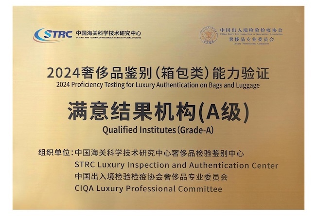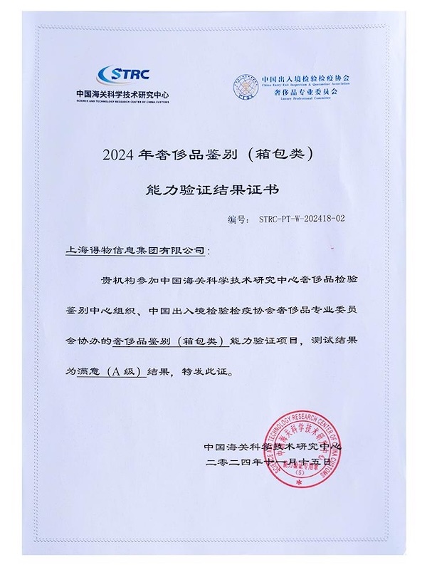 本次奢侈品鉴别能力认证,是中国海关科学技术研究中心对得物App奢侈品箱包鉴别能力进行严格考察,并经过权威专家团评审,认定得物App在鉴别专业性、鉴别准确度等方面都达到“满意(A级)”,因此授予得物App“奢侈品鉴别能力验证满意结果机构”资质认证。