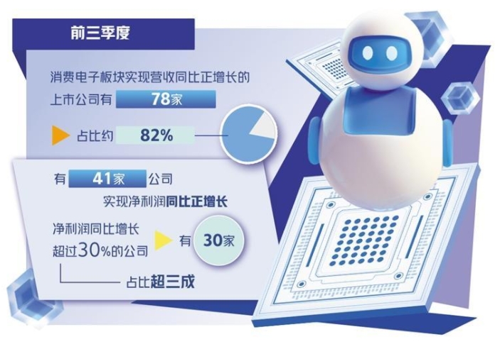 今年以来,消费电子板块复苏明显。数据显示,前三季度,消费电子板块实现营收同比正增长的上市公司有78家,占比约82%;有41家公司实现净利润同比正增长,净利润同比增长超过30%的公司有30家,占比超三成。尤其是第三季度,行业延续复苏趋势,一批公司实现营收、净利润的双增长。