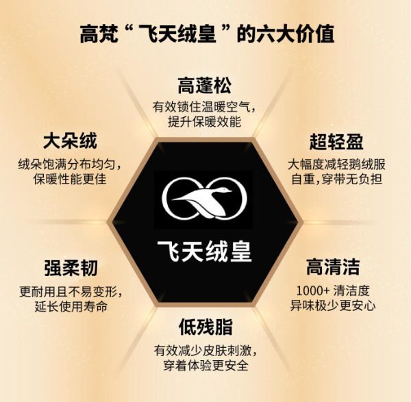 高梵早在2015年,就以行业参与者身份发起“良芯行动”,倡议用好绒,做高品质鹅绒服。经过多年在全球持续寻找最优鹅绒资源,最终逐渐建立起高梵“飞天绒皇”的六大价值。
