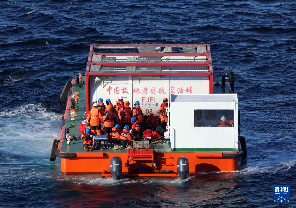 驳船将考察队员和油罐运送上站(12月25日摄)。