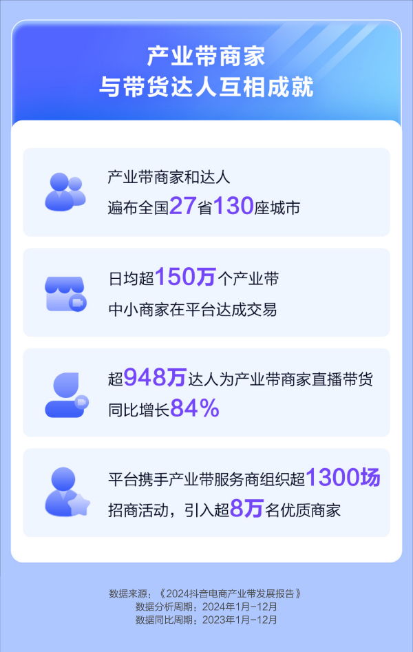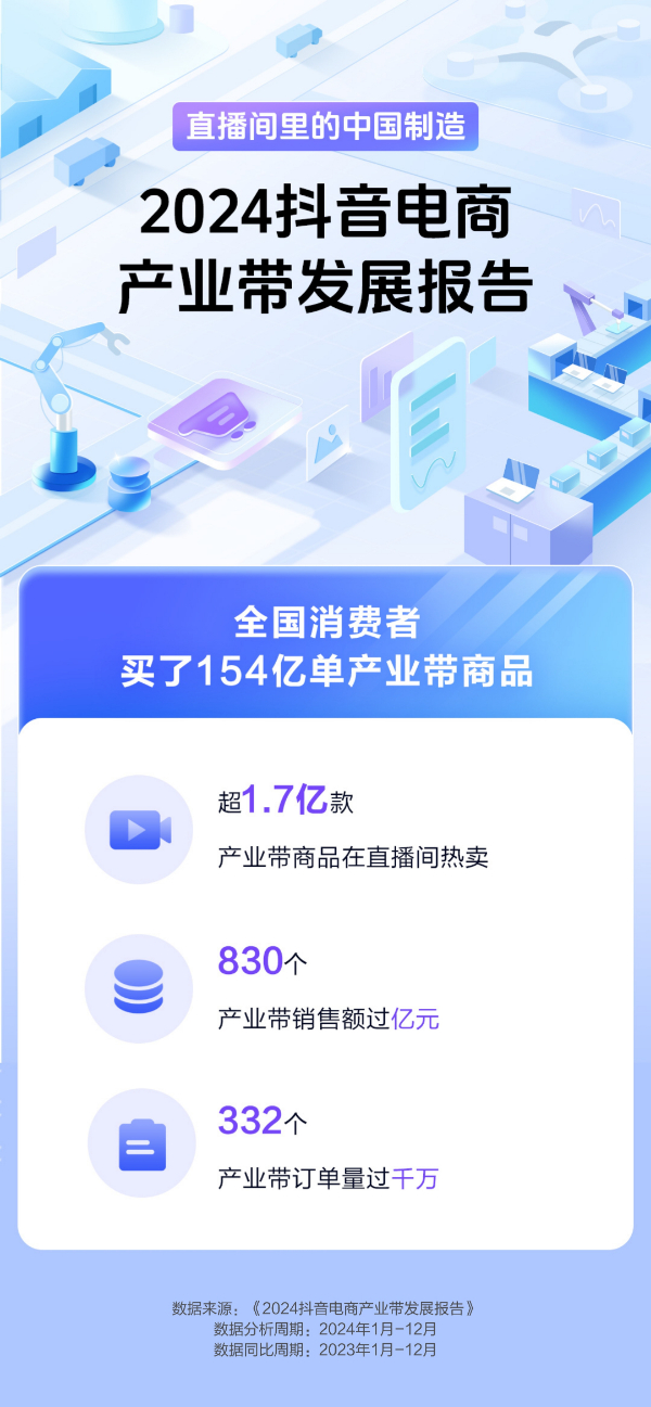 12月31日,抖音电商发布《直播间里的中国制造——2024抖音电商产业带发展报告》,全面盘点2024年全国产业带地区实体经济和中小商家在该平台的发展情况。