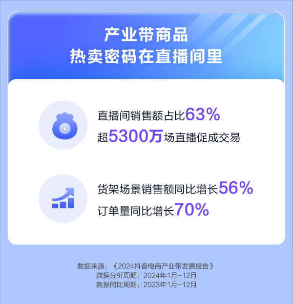 报告披露,过去一年,来自全国产业带地区的1.7亿款商品,在抖音电商售出154亿单,同比增长39%。其中,直播间销售额占比63%,累计有5300多万场带货直播促成交易,近15万款商品在直播间成为销售额过百万元的“爆款”。同时,货架场景订单量同比增长70%,与内容场景共同驱动产业带业务高速发展。