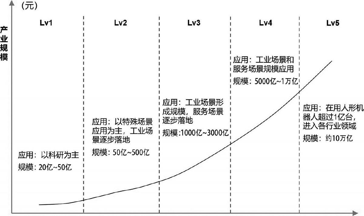 报告指出,从现在到2028年,全能型人形机器人将整体处于Lv1等级,以科学研究为主要落地场景,客户主要是从事人形机器人相关软硬件研究的高校、企业等科研团队,其他形态人形机器人则加速向Lv2等级演进,整机市场规模在20亿至50亿元。2028年到2035年,人形机器人整体进入Lv2等级,以特种场景应用为主,工业场景逐步落地,整机市场规模达到50亿至500亿元。2035年到2040年,人形机器人整体进入Lv3等级,在工业场景形成规模,服务场景逐步落地,整机市场规模达到1000亿至3000亿元。2040年到2045年,人形机器人整体进入Lv4等级,实现工业场景和服务场景规模应用,整机市场规模达到5000亿至1万亿元。2045年后,人形机器人整体进入Lv5等级,在用人形机器人超过1亿台,进入各行业领域,整机市场规模可达10万亿元级别。