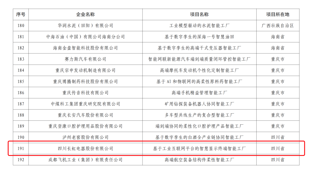 近日,工信部官网发布《关于卓越级智能工厂(第一批)项目的公示》。由长虹智能制造推进部协同党委宣传部、云计算与大数据研究中心,配合长虹智慧显示申报的“基于工业互联网平台的智慧显示终端智能工厂”上榜全国首批卓越级智能工厂名单。