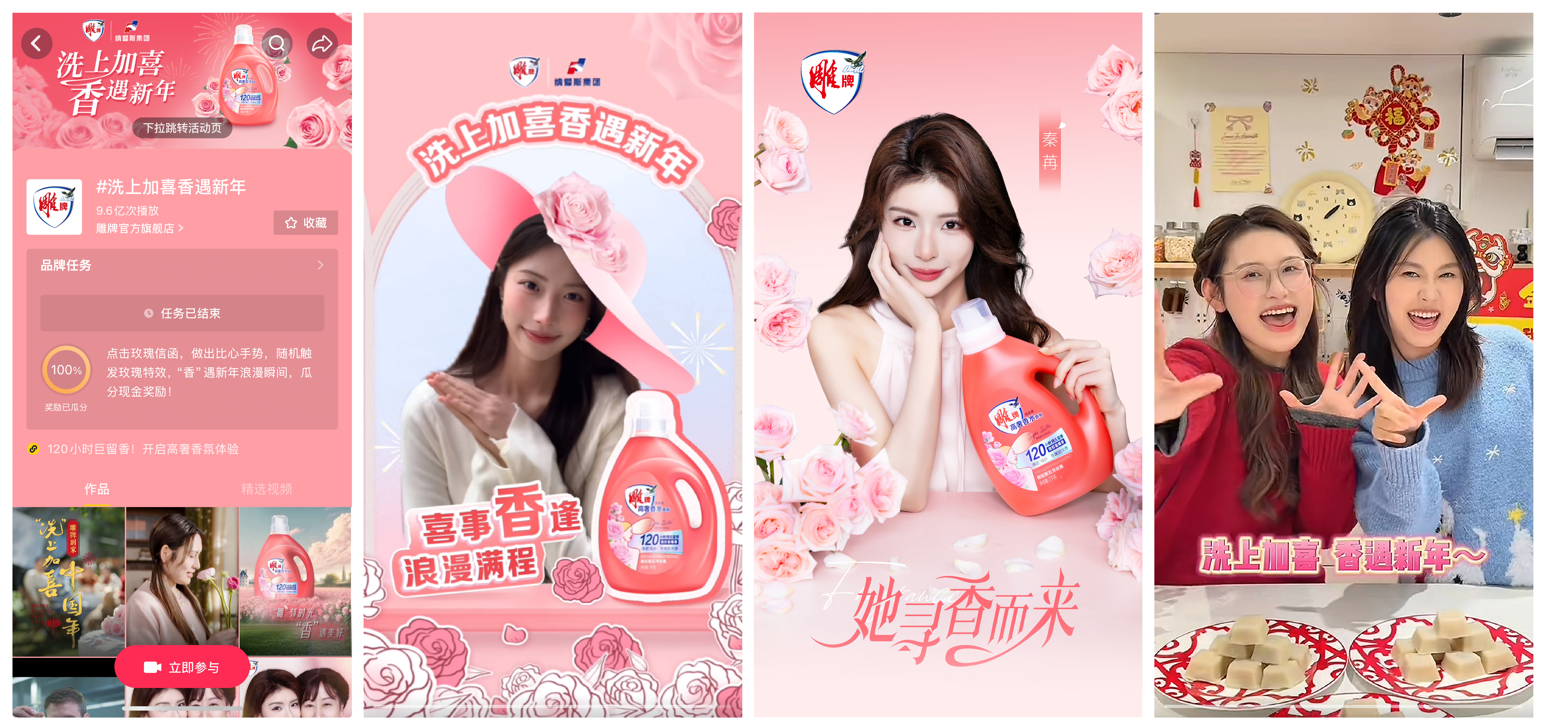 洞察这一时代变化的雕牌,以“‘洗’上加喜香遇新年”为主题,通过系列主题活动卷入全民共创,共同为中国春节注入新的文化内涵。通过推出品牌新春TVC、新华网新春短片、精品短剧、抖音挑战赛、新年上上签等一系列创意内容矩阵,吸引众多抖音创作者们用镜头记录下家庭传统过年场景、更秀出种种趣味“过年范儿”,从外出游玩到其乐融融的家庭聚餐,从置办年货到“洗去一身‘班味’”的仪式感,呈现出十足的“新年味”,话题播放量高达9.6亿次。其中,雕牌发起的创意挑战赛更是掀起了全民参与的热情,网友们通过点击“香”遇新年的第一封信,即可触发特效,一键实现玫瑰变装,既满足了大众对于新年焕新、喜迎新年的仪式感需求,也给这个新年带来满溢的玫瑰香气。