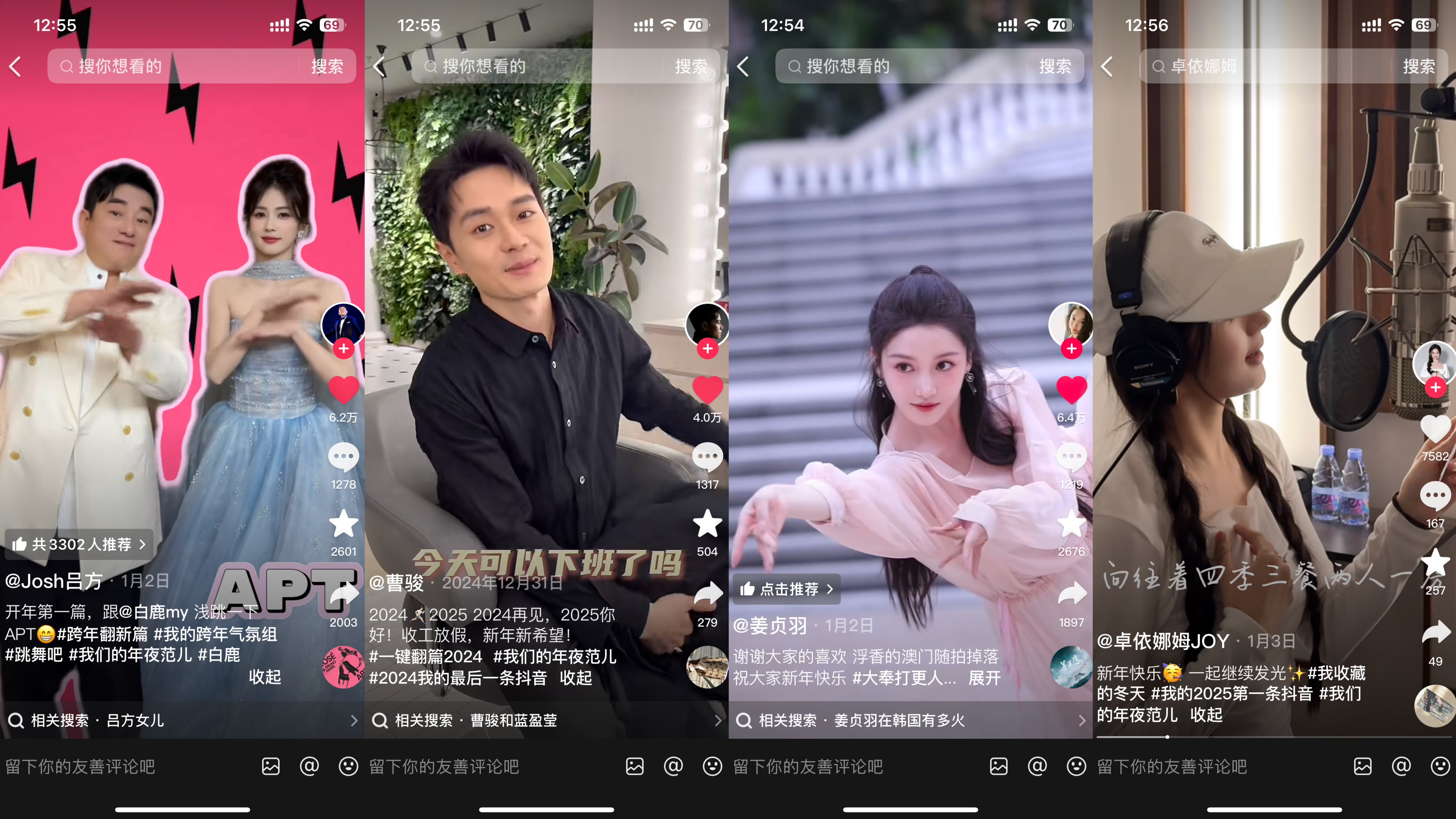 活动专属的热点话题#我们的年夜范儿在抖音一经上线便迅速升温,播放量超20.3亿。活动整合了丰富多样的核心视频与优质达人内容,成为展示活动魅力的重要窗口。抖音头部达人通过创意共创精心定制专属年夜范儿短片,@小小小海星与@哦吼小闪电共创的星图视频里,一场别开生面的南北年糕争霸赛激烈上演。@安秋金 独特的美食视角、@赵鹏皓和姐姐 的趣味生活分享、@Avacha 的动物园的趣味动物故事、@阿nic 的每一餐的精致美食制作、@潘姥姥 的采购年货等,这些短片从生活细微处着眼,从不同维度丰富了活动内涵,极大地增强了活动的吸引力与曝光度,让站内年夜氛围愈发浓厚热烈。更有姜贞羽、曹骏等明星大咖踊跃参与其中,通过短视频倾情分享各自独特的年夜范儿。明星达人们的内容创作深刻反映出当代年轻人在坚守传统习俗的同时,勇于探索新奇、追求品质生活的态度转变。