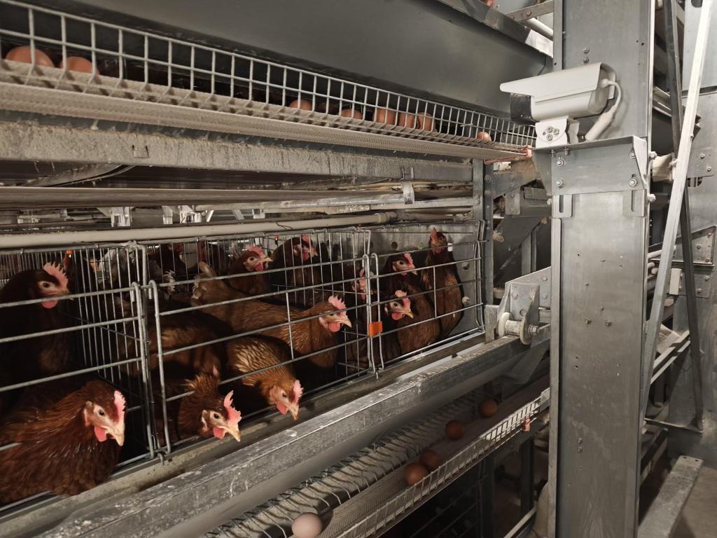 在唐山市晟三禽业有限公司的养殖房里,一排排三米多高的鸡舍整齐排列,全自动投料机器人正沿着轨道向料槽中投料。记者走近发现,投料机上还“长”了许多“摄像头”。