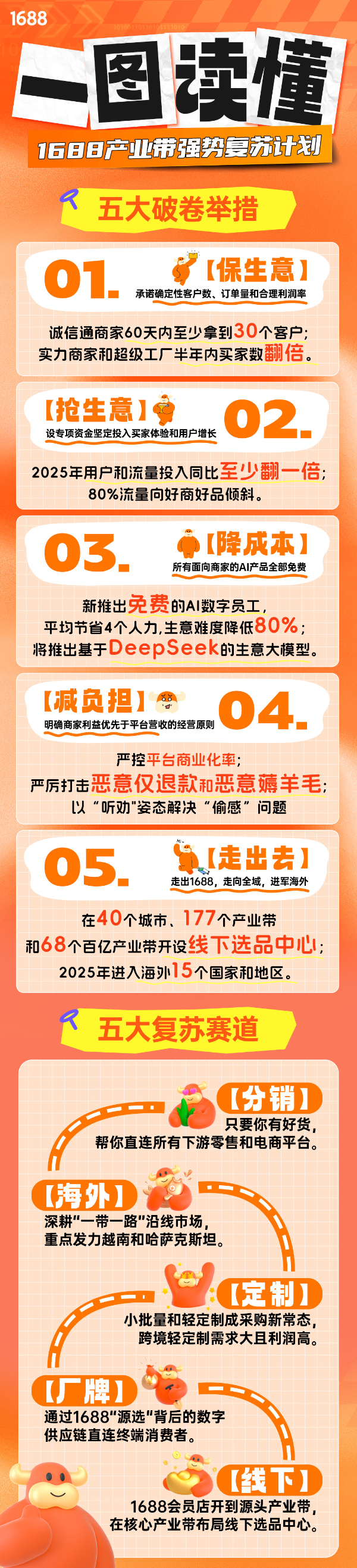 据悉,1688买家数量已从两年前的6500万增长至9600万,付费买家会员突破1000万。2024年,1688对流量的投入是上一年度的数倍,2025年投入将继续增加一倍。此外,80%流量向好商好品倾斜。