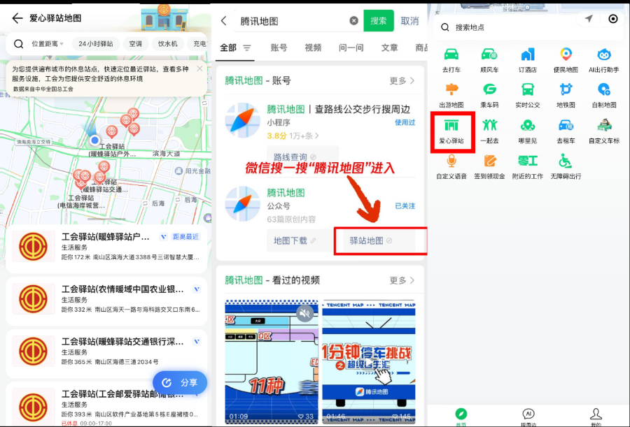 为方便更多户外劳动者知道驿站、找到驿站、大胆地进站休息,腾讯发布爱心驿站地图,覆盖全国超18万个驿站点位,将分散的驿站点位以主题地图形式聚集。户外劳动者可以通过地图快速查找附近的驿站歇脚点,其中有5万点位可查看是否为24小时驿站,驿站内是否有饮水机、充电宝、空调、急救用品、医药箱、卫生间等设备或功能。这张地图除了可以从微信里搜索“腾讯地图”点击“驿站地图” 便捷进入,也可以通过腾讯地图小程序首页“爱心驿站”入口、腾讯地图APP搜索“爱心驿站”关键词进入。