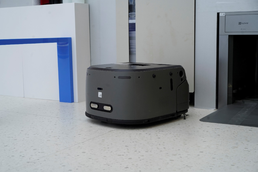 在智慧商用空间区,萤石云视觉商用清洁机器人BS1商用清洁机器人正在模拟商场地面清洁,D型紧凑机身轻松钻入桌底、物品间隙,还可贴边清扫、井回字形清扫,小巧且灵活。清洁完回到基站,机器人还可自主完成充电、加排水、清洁污水箱等任务,高度自动化,真正实现了无需人工值守。