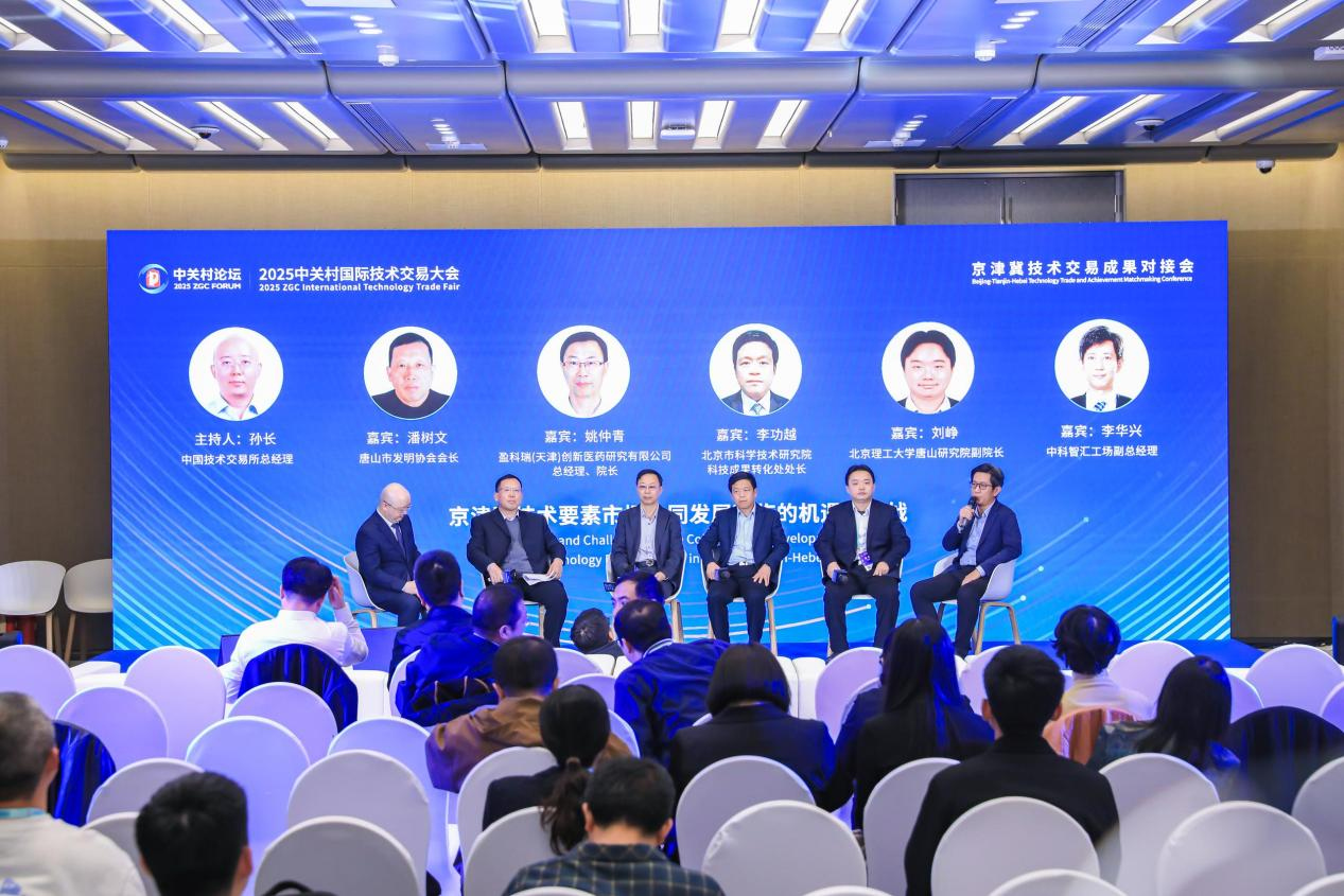圆桌对话环节由中国技术交易所总经理孙长主持。北京市科学技术研究院科技成果转化处处长李功越,北京理工大学唐山研究院副院长刘峥,盈科瑞(天津)创新医药研究有限公司总经理、院长姚仲青,中科智汇工场副总经理李华兴,唐山市发明协会会长潘树文围绕京津冀技术要素市场协同发展面临的机遇和挑战展开,深入探讨协同发展的创新模式。