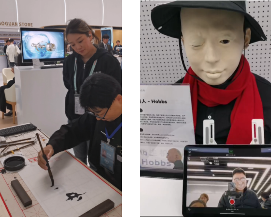 中关村论坛上的机器人书法家(左)
