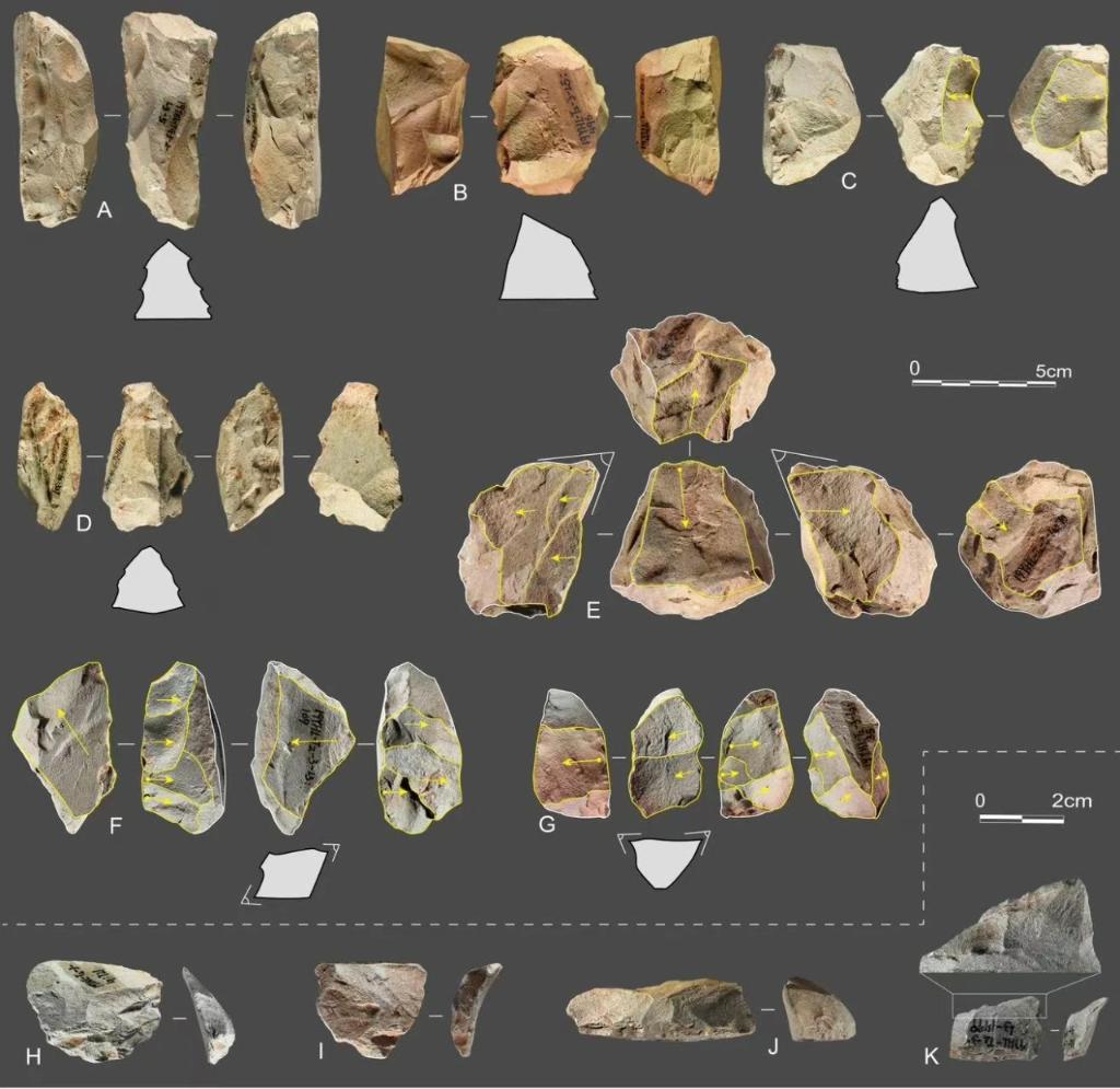 龙潭遗址基纳技术石制品。(A-D)基纳刮削器;(E-G)基纳石核;(H-J)再修理石片;(K)以再修理石片为毛坯制成的小型工具。(云南省文物考古研究所供图)