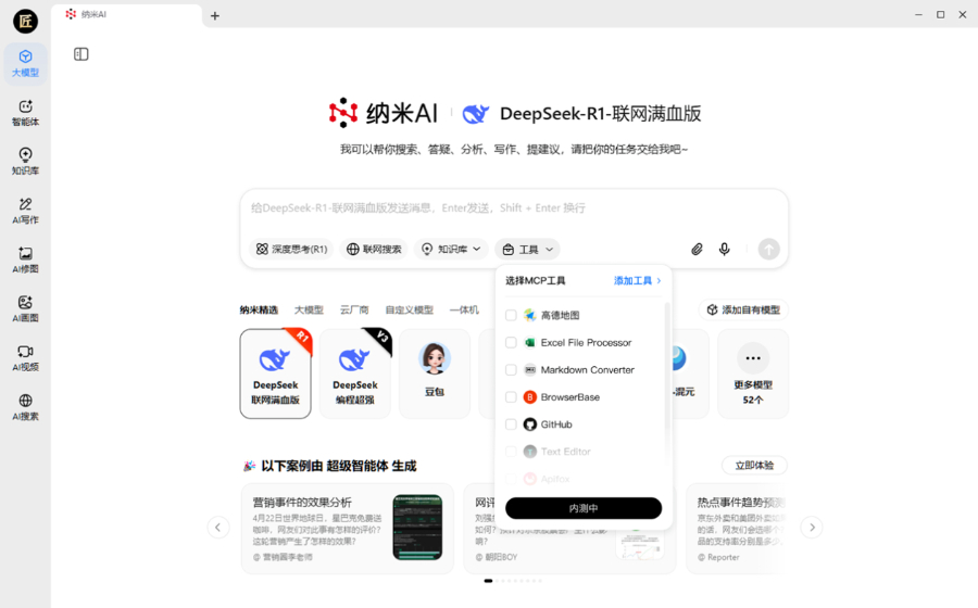 纳米AI产品负责人梁志辉介绍,MCP让大模型可调用工具,大家熟悉的Deepseek大模型过去只能做文本理解、内容生成的事情,但现在在纳米AI客户端里给DeepSeek 加上MCP 工具,DeepSeek 能帮你作图、编辑视频,或者调用其他工具来帮你办到过去大模型办不到事,最终解决“AI可用”的问题。当工具调用变得像呼吸一样自然,AI才能突破今天“只是个聊天机器人”的尴尬,才能进化成真正的“数字员工”。