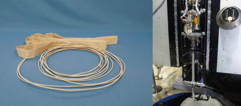 这一装置是由中国工程院院士、哈工大机电工程学院教授邓宗全团队,与哈工大化工与化学学院高分子化工团队参与研究设计。最外层是可以旋转钻进的钻杆,紧靠钻杆内部的是取芯管,中间藏着取芯软袋。取芯软带是用高分子纤维编织而成,耐高温、易翻折、质地柔软、强度极高,能承受4000牛顿以上的拉力,大约相当于提起400千克的重物。