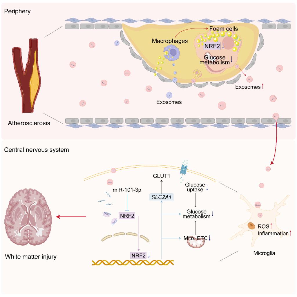 研究中,团队综合运用公共数据库、动脉粥样硬化患者队列、单细胞测序及多组学联合分析等技术手段,发现了动脉粥样硬化循环外泌体的异质性。这些外泌体能够将氧化还原失衡和代谢缺陷传递至中枢神经系统中的小胶质细胞,从而加剧缺血性脑白质损伤和认知功能障碍。这揭示了动脉粥样硬化加剧脑白质损伤的全新病理生理机制。