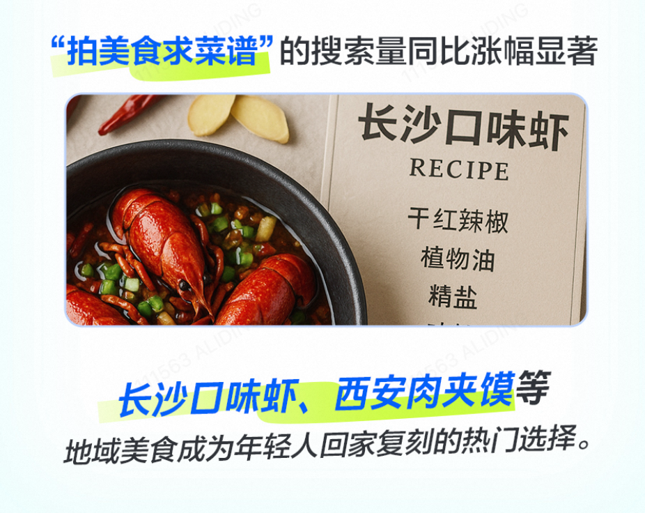 同时,“拍美食求菜谱”的搜索量同比涨幅显著,长沙口味虾、西安肉夹馍等地域美食成为年轻人回家复刻的热门选择。假期中,小龙虾、烧烤和冰粉位列最受AI相机用户追捧的快手菜。他们通过“拍照问夸克”找到正宗菜谱,即便是厨艺小白也可以秒变“厨神”。
